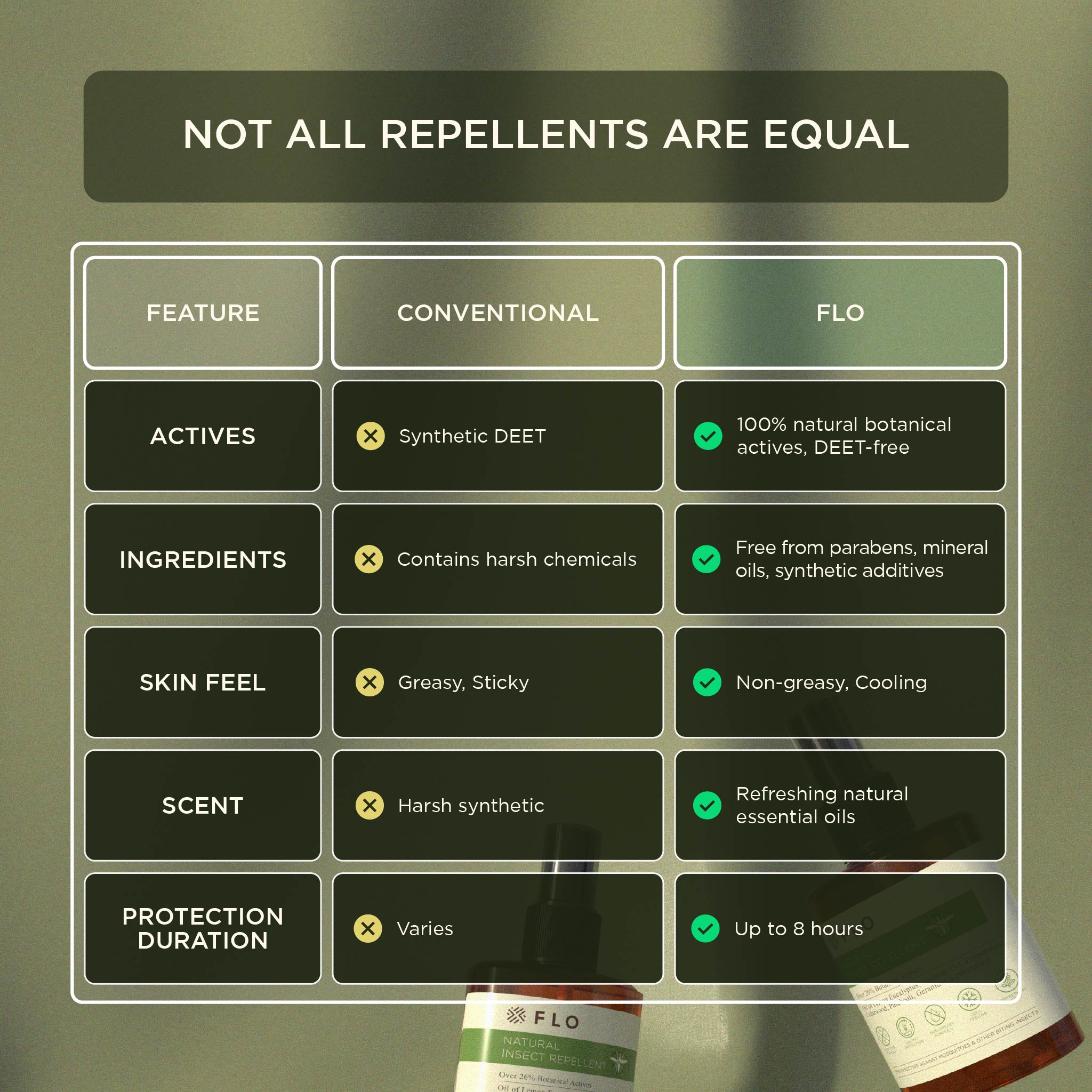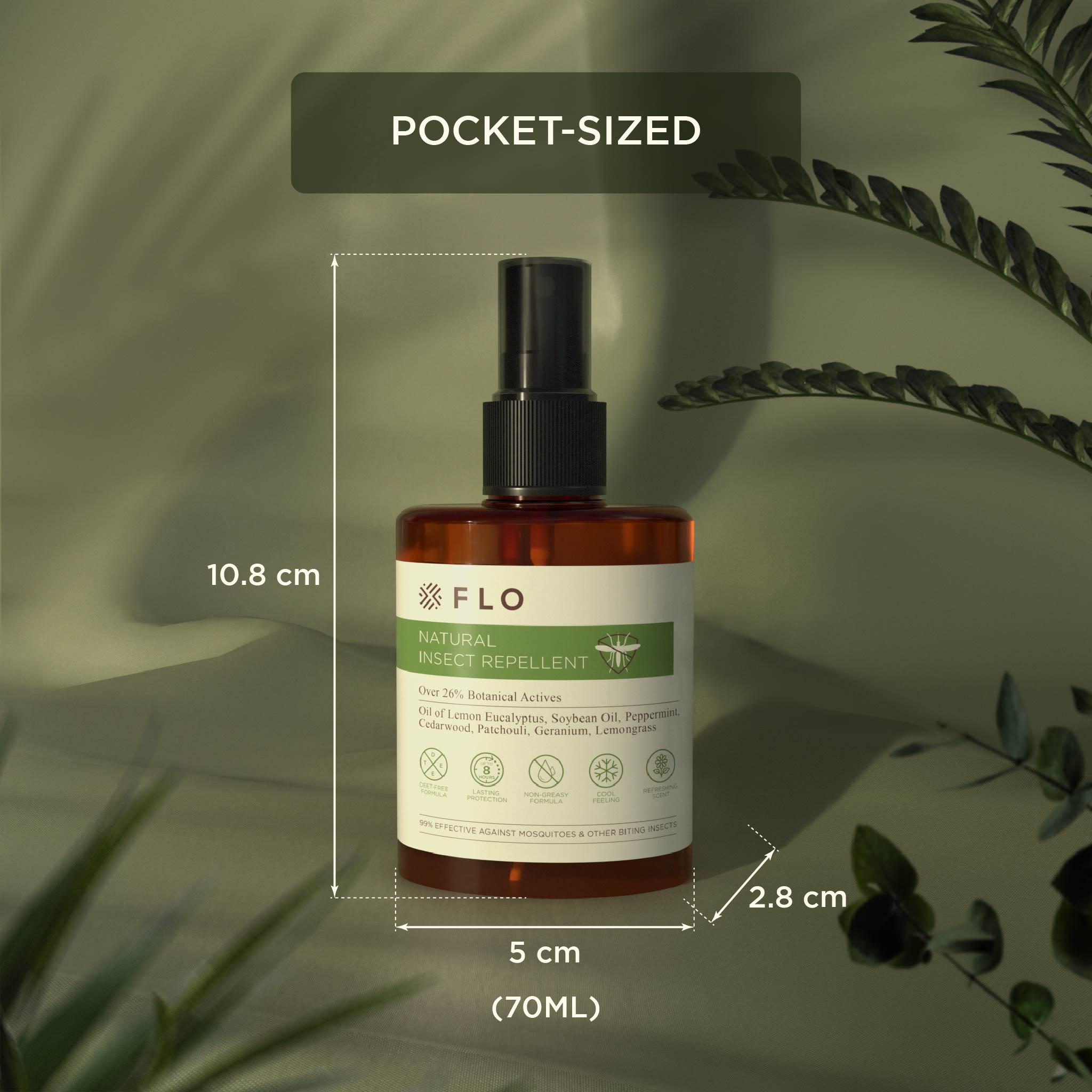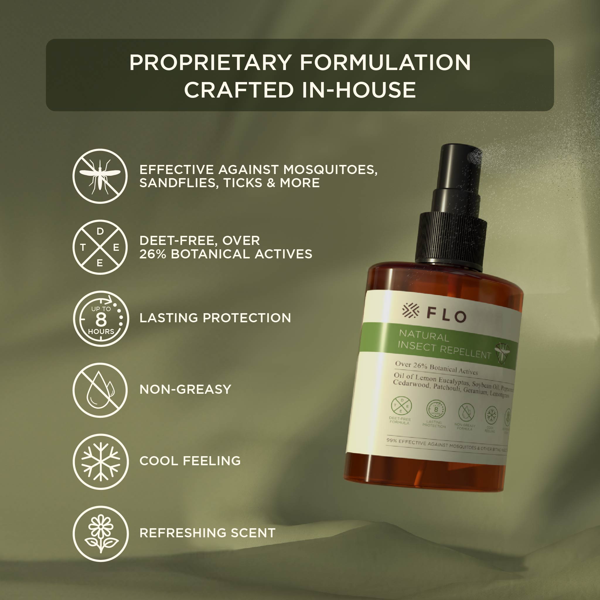 Our FLO Natural Insect Repellent is thoughtfully crafted to stand apart from the typical insect repellent scent. Instead of the sharp citronella smell, you'll notice refreshing top notes of lemon eucalyptus, peppermint, and lemongrass, which give way to a heart of geranium and cedarwood. The base of patchouli adds a grounding warmth, leaving you protected and surrounded by a pleasant, natural aroma.