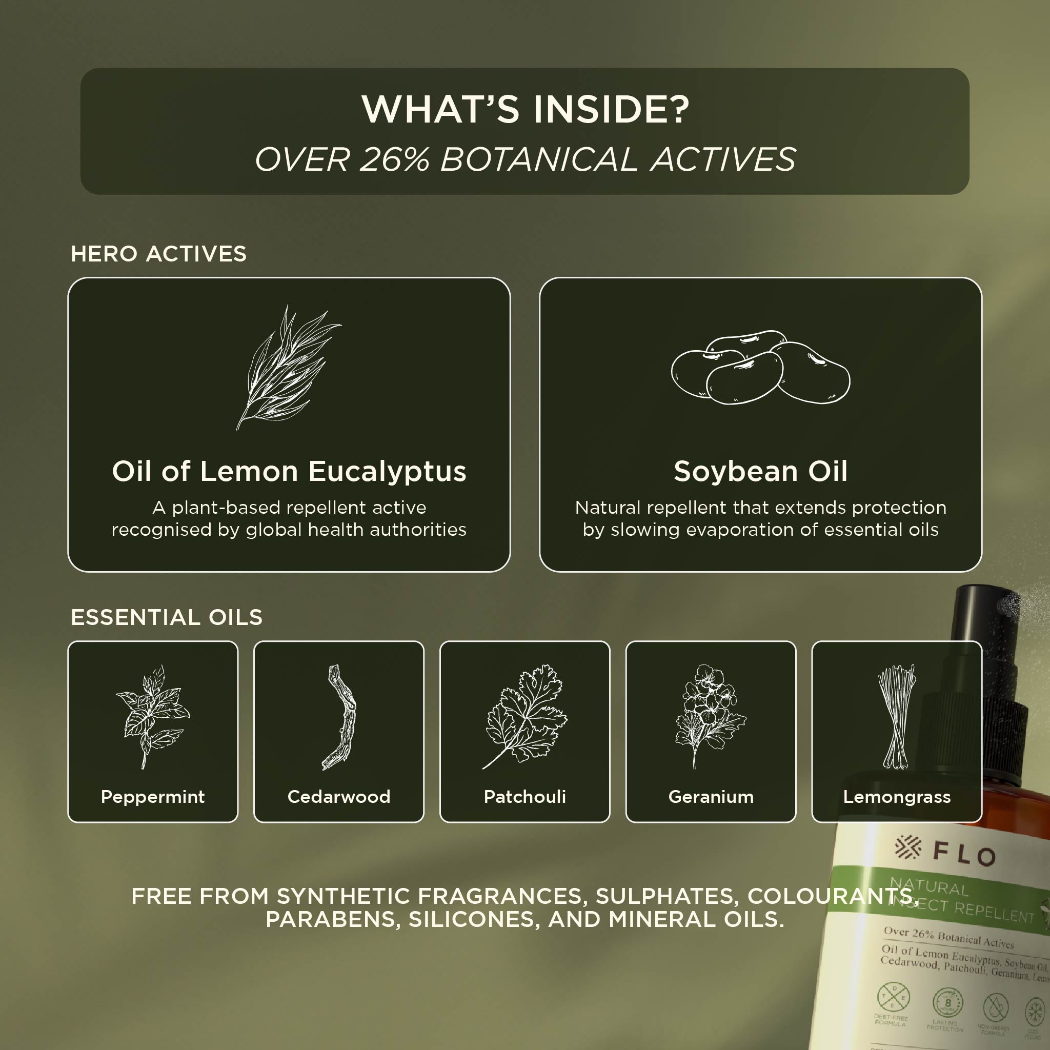 Active Ingredients: Oil of Lemon Eucalyptus (OLE), Glycine Soja (Soybean) Oil, Pelargonium Graveolens (Geranium) Oil, Mentha Piperita (Peppermint) Oil, Cedrus Atlantica Bark (Cedarwood) Oil, Cymbopogon Citratus (Lemongrass) Oil, Pogostemon Cablin (Patchouli) Leaf Oil--- 26.25%